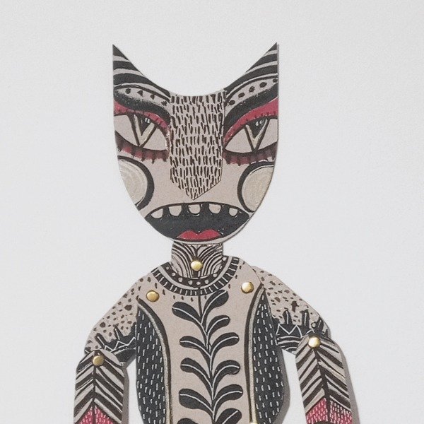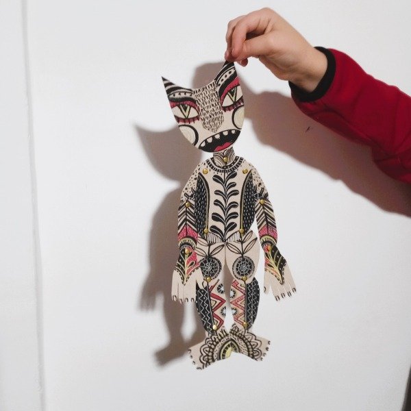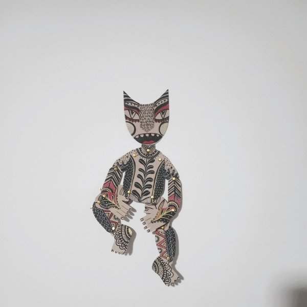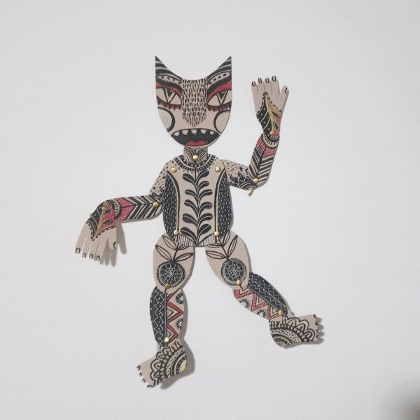 Marioneta realizada completamente a mano, con detalles inspirados en el arte popular y motivos de calaveras. Cada pieza es única, pintada con acrílicos, marcadores y tintas sobre estructura de cartón. Ideal para decoración o como pieza artística de colección.